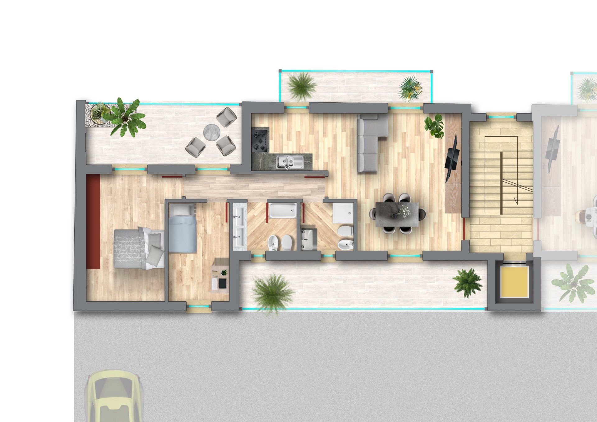 I quadrivani e parte dei trivani avranno il posto auto coperto situato al piano pilotis. Alcuni trivani avranno il posto auto scoperto.