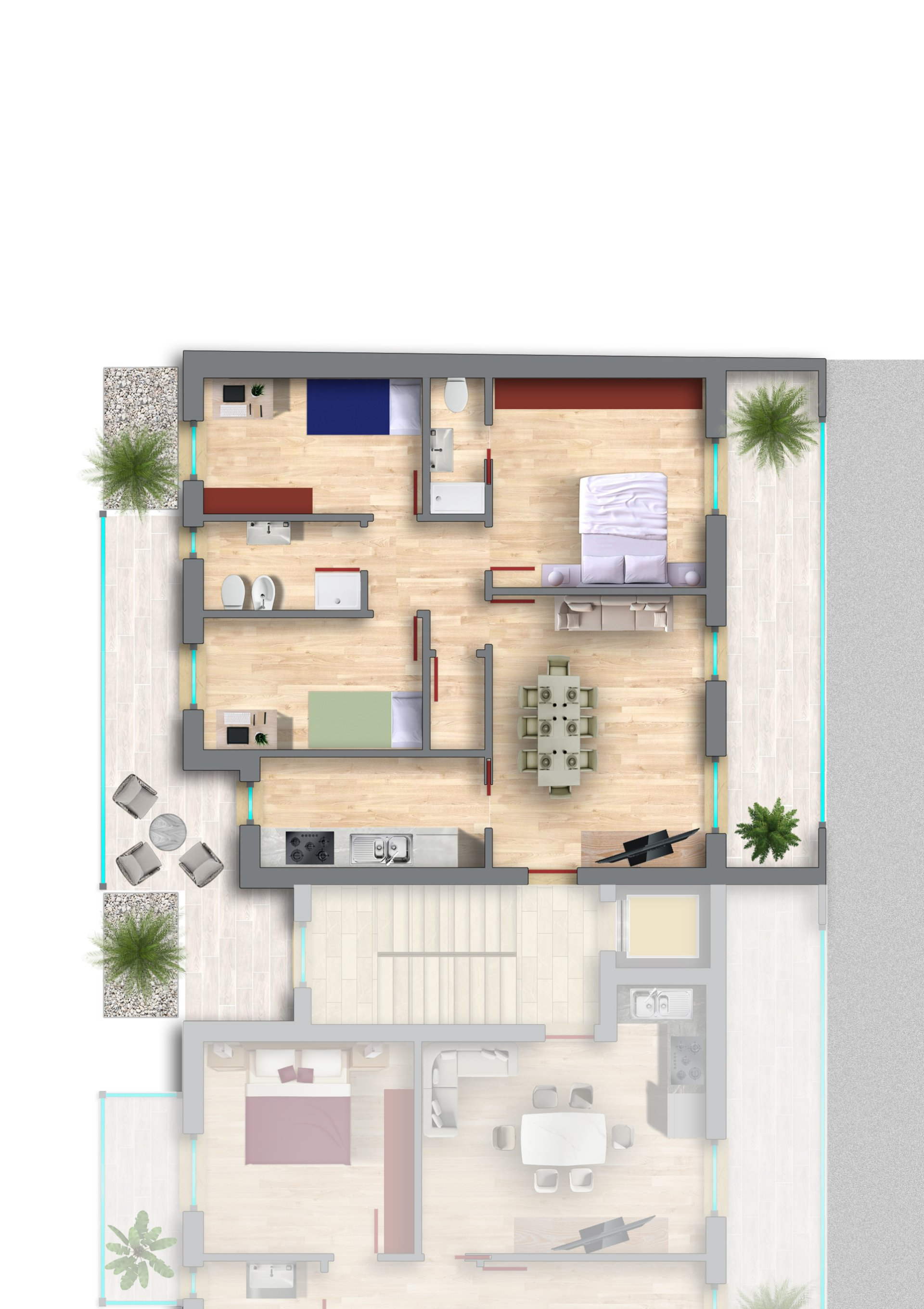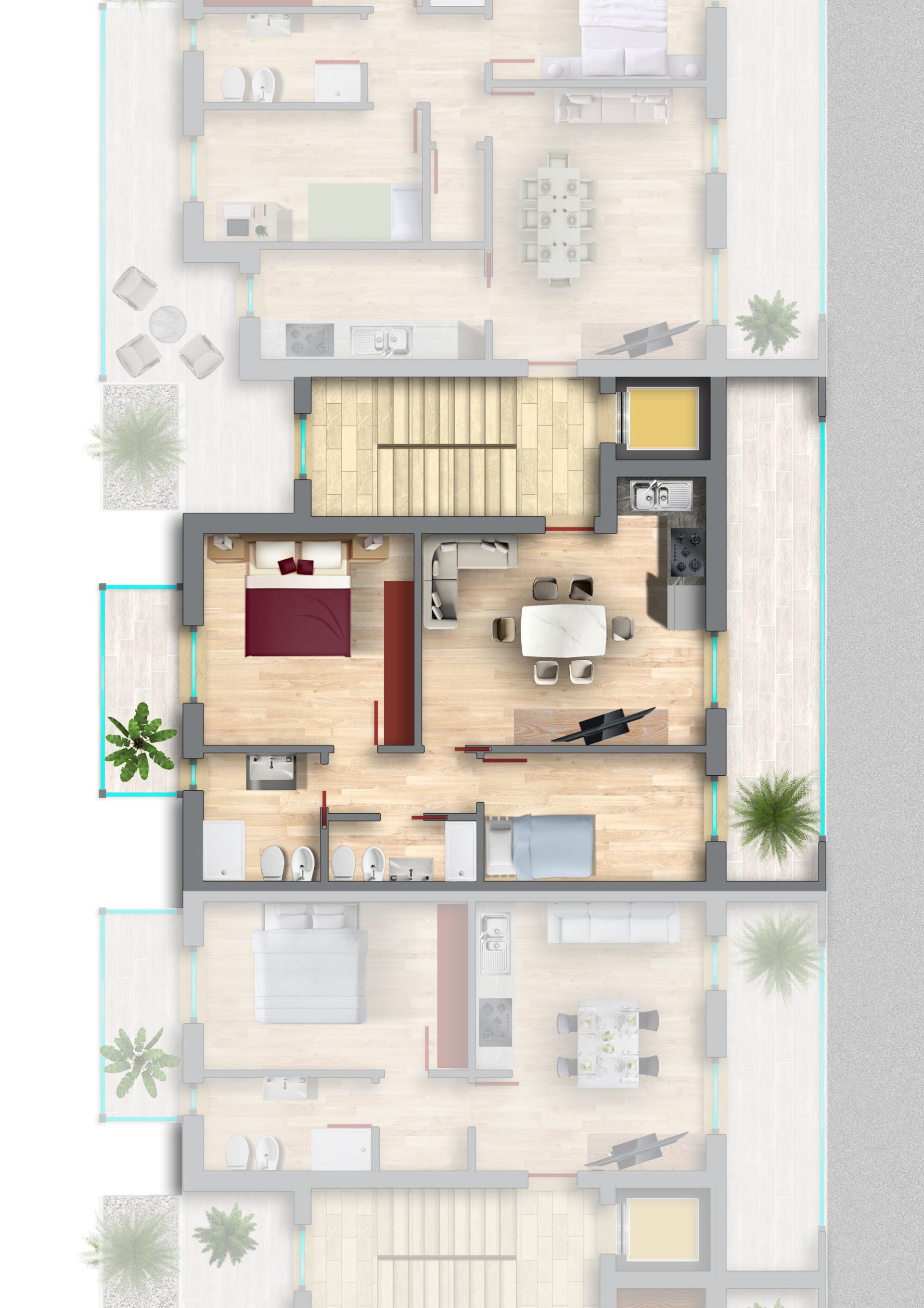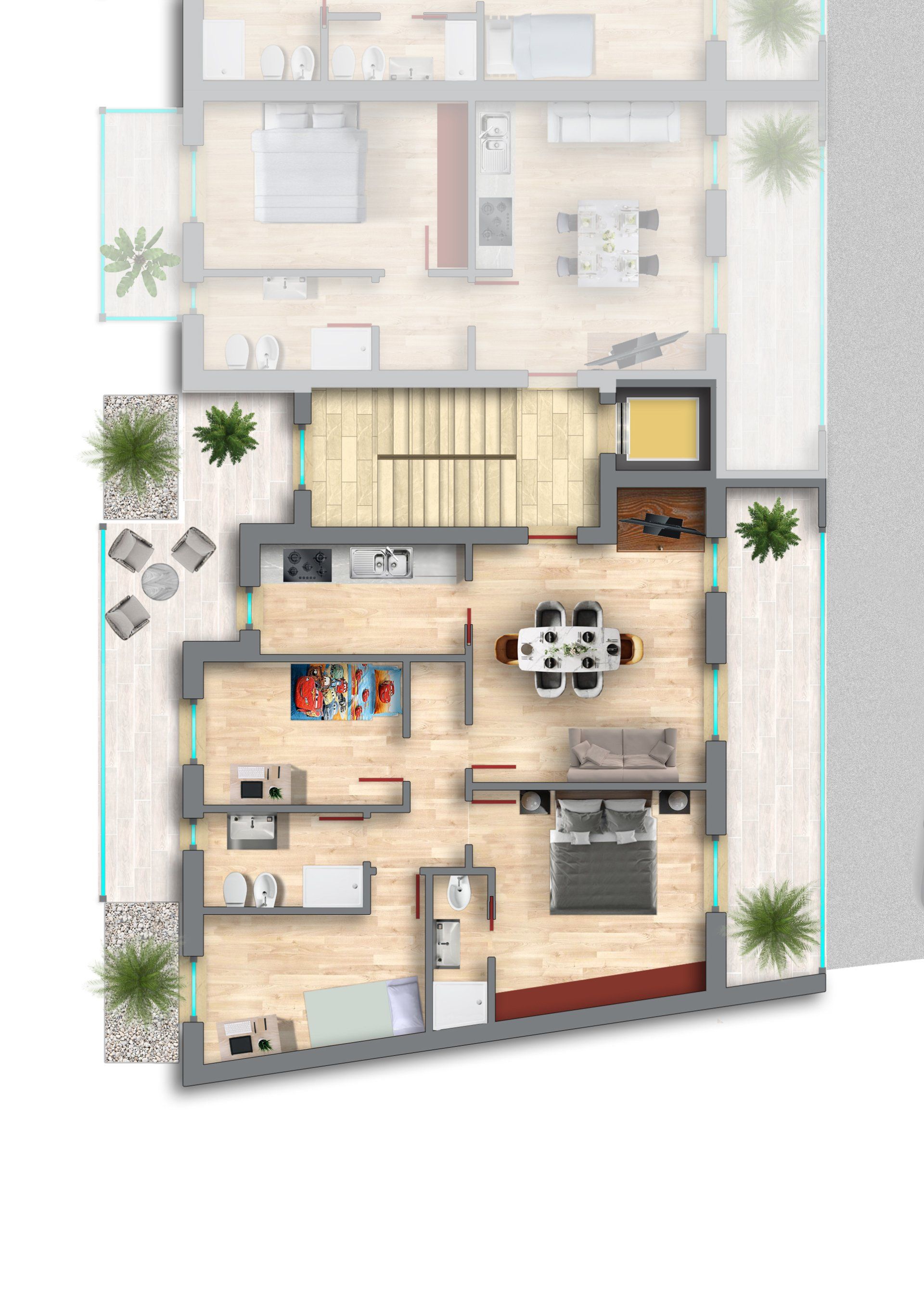 Il quarto piano avrà di pertinenza e proprietà la terrazza sovrastante della metratura simile all’appartamento.